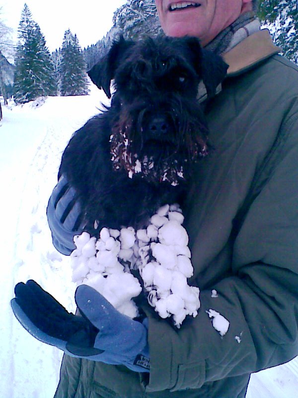 I morse gick jag stora rundan med StinaPinaFina, den runda som tar ungefär en timme och en kvart. Men det hade jag inte behövt för senare tog vi bilen och åkte djupt djupt in mellan bergen på en smal väg som gick stadigt uppåt med bergvägg på ena sidan och stup ner mot bäcken Rättenbach på den andra. Till slut lämnade vi iallafall bilen och gick en rejäl vandring till fots till en Alm (= fäbod) där två skidåkare flöt fram i en milslinga. Det såg härligt ut. Vi själva fick pulsa genom snön. Ibland var det en liten knagglig isig stig som någon tidigare hade banat men… för det mesta fick vi pulsa. StinaPinaFina fick fina tjocka vita damasker som hon försökte bli av med genom att slita och bita i snöbollarna.