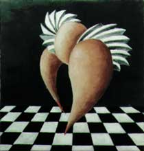 (En av Margareta Renbergs surrealistiska målningar)  …  Skatans nya outfit?  Eller …