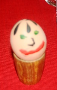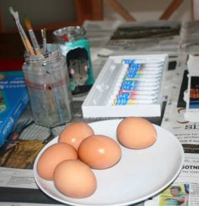 Skatan plockade fram lite färger och penslar för  äggen skulle förstås målas … Det bara måste man innan äggpickningstävlingen tar sin början.