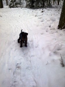 … och StinaFina på stigen … som kan dölja rötter och stenar och hala isfläckar under sitt härliga vita snötäcke …