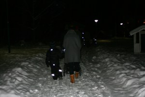 Hon gick in i mörka skogen nära huset och tyckte det gick ganska bra att se ändå … med snön som lyste upp … men ett tu tre satt hon där på rumpan och stirrade lite fånigt ut i kolmörkret. Hon kravlade sig upp efter en förvånad stund, borstade av sig och tackade sin Gud att hon inte brutit, vrickat eller på annat sätt gjort sig illa. Mobilen hade hon ju inte heller till hands.