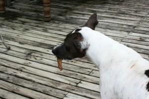 … eller får till och med lunchsällskap … som av den här som kom upp och erbjöd Skatan ett löv … men innan Skatan fått upp kameran hade hunden hunnit vända sig om …