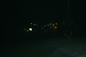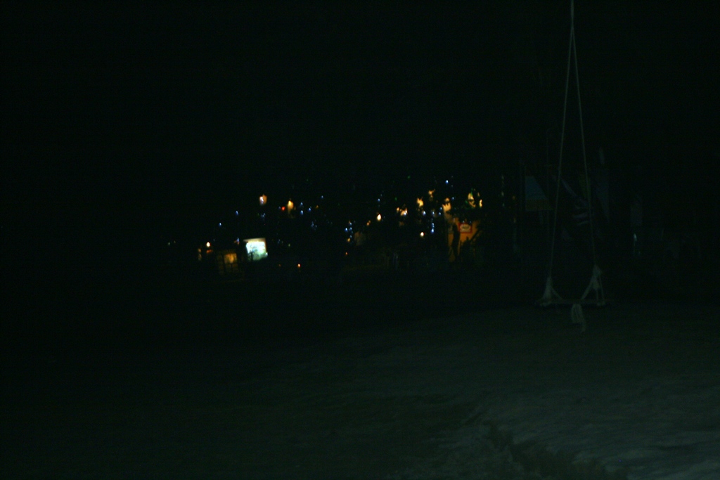 Så här mörkt är det redan klockan åtta när Skatan kommit ner till stranden på väg mot Tango … ni kan i alla fall skymta gungan vid Apple där till höger …