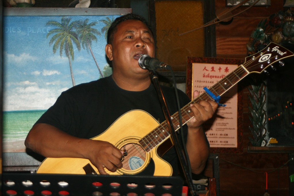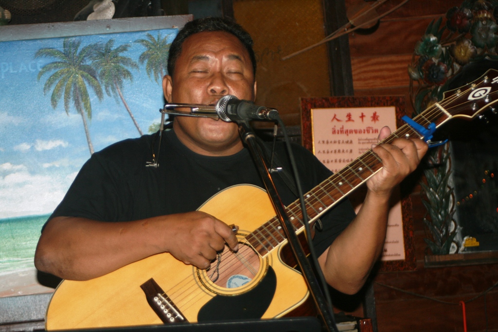 och han sjöng … hmn … Yesterday, The house of the rising sun, Blowing in the wind … på sitt alldeles egna personliga sätt … blandat med thailändska sånger.