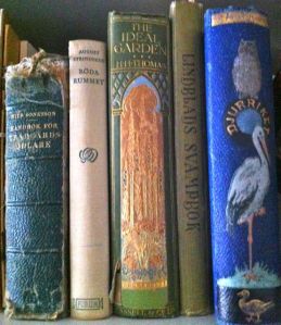 För övrigt har inte pappa särskilt god ordning bland sina böcker.  Här står ännu en Strindberg inklämd mellan trädgårdsböcker och en svambok och en om Djurriket, den vackra blå.