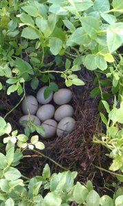 Äggen är gräsandsägg … en gräsand har lagt dem i en liten dunge precis framför dasset på landet och hon ruvar dom fortfarande men är förstås borta timmar i sträck när hon blivit uppskrämd. Jag hoppas att det ”blir” något. Vi får väl se …