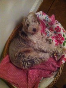 Bessie … som nästan är stendöv … sov  lugnt i sin korg.