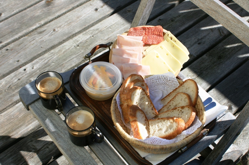 Alla dagar vandrade de … längs Hallstatter See för att stanna och äta och dricka en öl på Seeräumchen … ibland rundade de en sjö … Swartzensee där de startade i dimman som lättade och släppte fram solen och värmen när de satt ute och åt … Skatan en soppa med pannkaka i …
