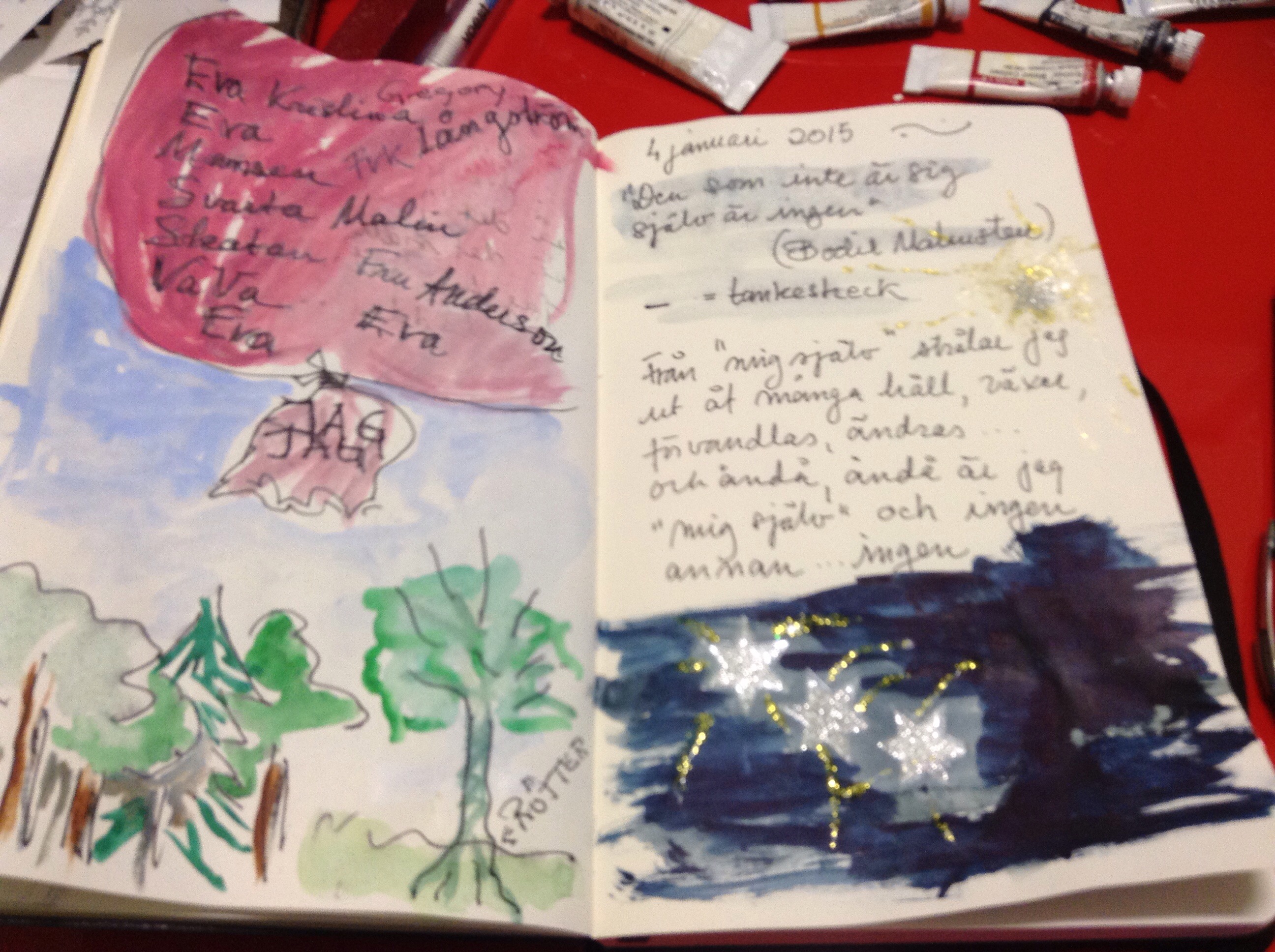 Skatan hoppas innerligt på att hon hamnar i samma plaskdamm som Bodil Malmsten … och Margith … och Mamma … och Pappa … och Thomas … och … Herreguuud (nu hädar hon dessutom) … ja … men hoppas att plaska omkring igen med alla de där personerna som har gjort hennes liv så levande, så värt att leva … och att alla som kommer efter henne … alla hennes fina vänner … också landar där med ett plask bredvid henne när det är så dags för dem.