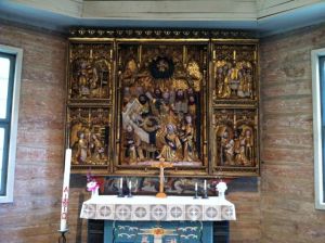 En titt in i den gamla vackra röda träkyrkan där en söt sommarvärd, Linn, berättade om det magnifika altarskåpet från 1400-talet och staden Lübeck och om votivskeppet … men då lyssnade inte Skatan som sprang runt och tittade på annat …