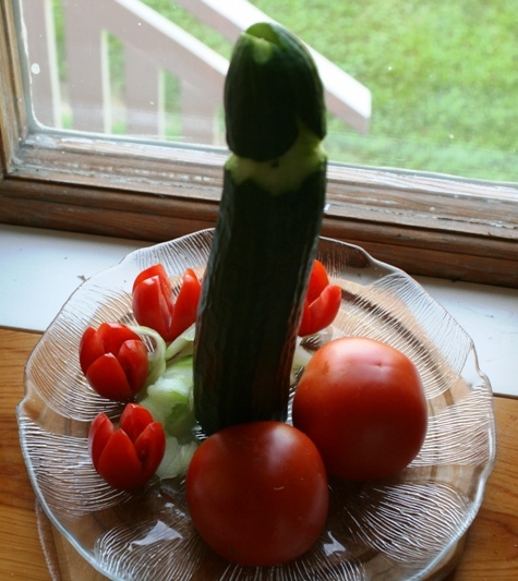 Nu var det så att vi hade en gäst som får akupunktur och dietförslag och hjälp att gå ner i vikt av Kinesen, ni vet. Och på kvällarna får hon bara äta gurka och tomater … och dricka vatten.