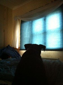 På morgonen vaknade Skatan … solen sken in från vardagsrummet, StinaFina tittade längtansfullt mot det rullgardinsförsedda fönstret … och Skatan tog sats.