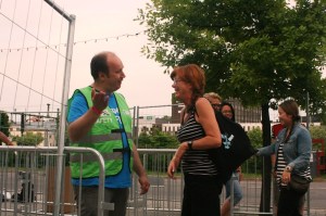 Sonen körde oss … Alice och Skatan och vagnen … ner till var Karin (äldsta dottern) höll hus med sitt följde innan vi promenerade ner till festivalsområdet för att hämta ut inträdesbandet till Skatan.