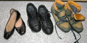 Skatan har inte så många par att välja på här nere eftersom hon bara packat med sig ett par och så dom hon gick i. Om sanningen skall fram är det bara Geox-skorna av ballerinaskomodell som är hennes favoriter. De i mitten har hon för att hon måste (de är köpta på en sån där Reband-affär med fotriktiga doningar … de hon gillar bäst därifrån men inte kan ha så här års är såna där Masai-skor som man gungar fram i) och kängorna längst till höger är såna där vandrarkängor som alltid står här nere … beredda. De är i och för sig sköna och funktonella … men inga favoriter egentligen.