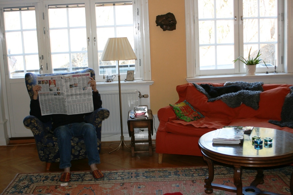 StinaFina på soffryggen på sitt fårskinn och Mannen bakom en tidning i ”hans” älsklingsfåtölj …