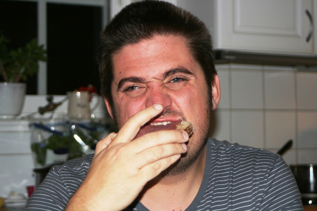 Pappa tar ett stort bett på mackan … för nu är det bråttom …