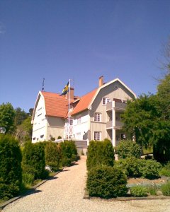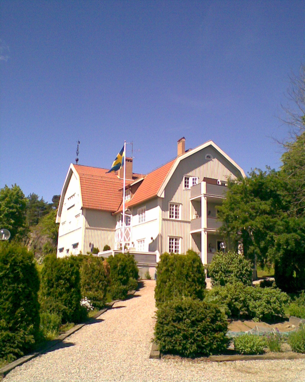 Villa Skogsberg hissar flaggan i topp denna dag som åtminstone här i Sörmland fortfarande är strålande vacker med en värmande sol från en klarblå himmel.